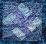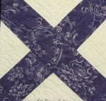 Cool, jewel-toned blues and plum on white backgrounds. NF4's 12" blocks showcased deep indigo and purple fabrics paired with crisp white.