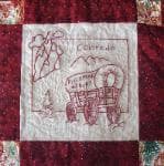 Red embroidery on white or cream backgrounds in the classic redwork tradition. NF19's 9" blocks featured state symbols, flowers, and regional imagery rendered in a single bold thread color.